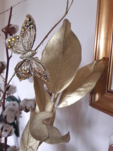 Morda imate občutek, da je v zimskem času težje na mizo postaviti šopek, ki bo v duhu praznikov, a hkrati ne bo iz umetnih materialov. Sama sem se odločila za prelepe, puhaste vejice bombaža, ki sem jim dodala vejico zlato obarvane magnolije in vejico belo obarvanega lotusa. Za piko na i sem pripela zlatega, kovinskega ptička in dva metulja iz blaga.