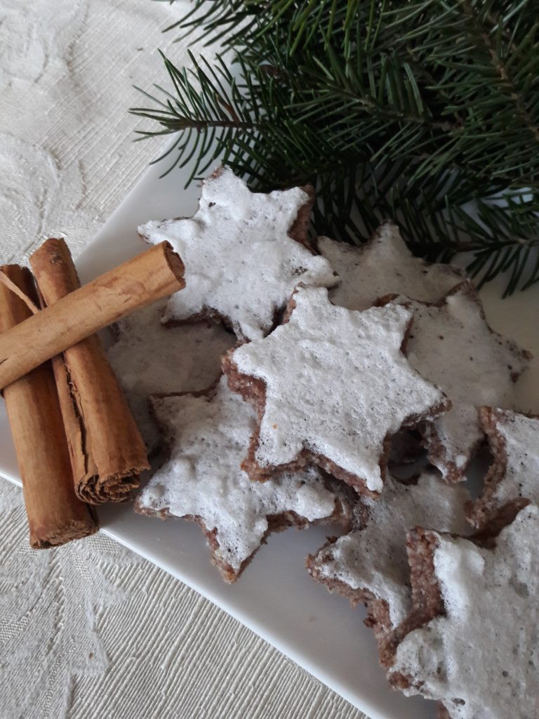 Priprava: Beljake stepemo v čvrst sneg, ki mu predhodno lahko dodamo majhen ščepec soli. Ko je že trd, mu med stepanjem, postopoma dodajamo eritritol. Stepamo tako dolgo, da dobimo bleščeč in trd sneg. Odvzamemo približno 1/3 snega, ki ga postavimo v hladilnik. V skledi zmešamo mandlje in cimet, nato počasi dodajamo beljakov sneg, ki nam je ostal, torej 2/3. Dobimo nekoliko lepljivo testo, ki ga za 15 minut postavimo v hladilnik, da se ohladi. Testo razvaljamo med dvema peki papirjema, na približno debelino 5- 8 mm. Z modelčkom izrežemo zvezdice, ki jih polagamo na pekač. Premažemo s snegom, ki smo ga hranili v hladilniku. Tako pripravljene zvezdice lahko preko noči pustimo na sobni temperaturi, da se nekoliko osušijo in jih spečemo v pečici (približno 10 – 15 minut na 150 stopinj) prihodnje jutro. Lahko pa jih spečemo takoj, vendar v tem primeru izberemo nižjo temperaturo s programom sušenja in nekoliko daljšim časom pečenja, da beljak ne bo porumenel.