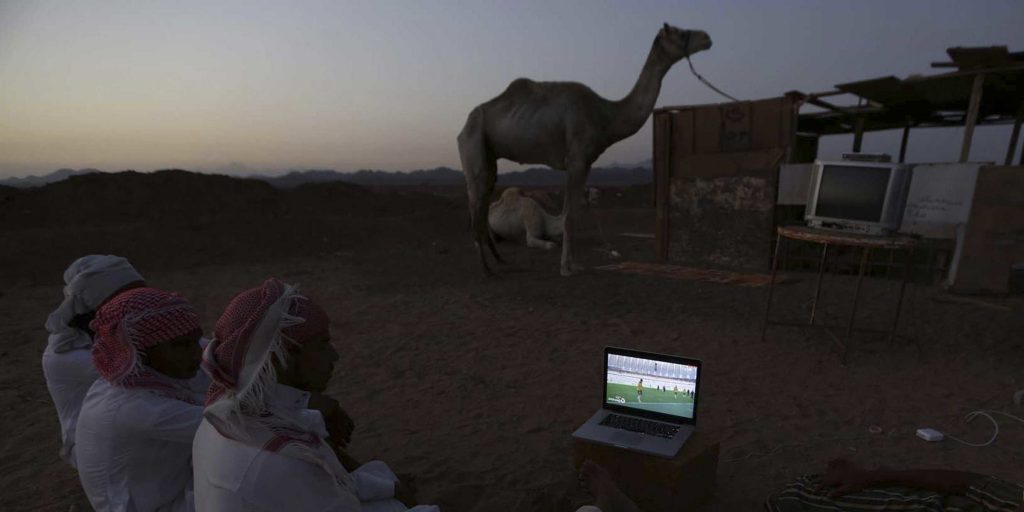 Moški na tržnici kamel gledajo tekmo med Avstralijo in Nizozemsko. Daba, Savdska Arabija, 2004
