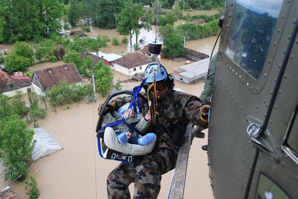 Reševalci Slovenske vojske rešujejo dojenčka v Tišini, Bosna in Hercegovina, med največjimi poplavami v zadnjih 120 letih